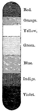 We have already seen that a beam of white light emitted from the sun, and refracted by a prism, is decomposed by its action into seven different colours, which compose what is called the Prismatic Spectrum, and which is nothing more than an elongated image of the sun, its length being five time its breadth, and the coloured <74> spaces having the proportions shewn in the annexed figure.