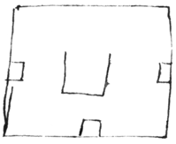 Figure interioris {versos} in exterius, ita ut \latitudo. Atrij exterioris/ inter portas duas Orientales {illeg} latitudo Atrij exterioris sit centum cubitorum, inter duas {illeg} boreales totidem et inter duas australes etiam totidem. {sic} Ezek cap. 40 (vers 19, 23, 27.) Ita portarum duarum longitudines et intervallū \conjunctim/ efficiunt latitudinem distantiam duecentorum pedum undi a \undi/ inter murū utrius Atrij exterioris \externum/ et septū \Atrij/ interioris, et hæc est latitudo tota Atrij exterioris, præterquam ad occidentem ubi Templum stabat. {illeg} Ibi dempta latitudine {illeg} loci separati restat tantum latitudo centum cubitorum. Eze ut \etiam/ habet Ezekiel c 41.15. {Tēplo et portic} In loco seperato \ita/ stabat Templum ita ut