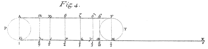When I had caused the rectilinear sides AF, GM, of the Spectrum of Colours made by the Prism to be distinctly defined,[Image 5] as in the fifth Experiment of the first Book is described, there were found in it all the homogeneal Colours in the same order and situation one among another as in the Spectrum of simple Light, described in the fourth Experiment of that Book. For the Circles of which the Spectrum of compound Light PT is composed, and which in the middle parts of the Spectrum interfere and are intermixt with one another, are not intermixt in their outmost parts where they touch those rectilinear sides AF and GM. And therefore in those rectilinear sides when distinctly defined, there is no new Colour generated by refraction. I observed also, that if any where between the two outmost Circles TMF and PGA a right Line, as γδ, was cross to the Spectrum, so as both ends to fall perpendicularly upon its rectilinear sides, there appeared <92> one and the same Colour and degree of Colour from one end of this line to the other. I delineated therefore in a Paper the perimeter of the Spectrum FAPGMT, and in trying the third Experiment of the first Book, I held the Paper so that the Spectrum might fall upon this delineated Figure, and agree with it exactly, whilst an Assistant whose Eyes for distinguishing Colours were more critical than mine, did by right lines αβ, γδ, εζ, &c. drawn cross the Spectrum, note the confines of the Colours that is of the red MαβF of the orange αγδβ, of the yellow γεζδ, of the green εηθζ, of the blue ηιχθ, of the indico ιλμχ, and of the violet λGAμ. And this operation being divers times repeated both in the same and in several Papers, I found that the Observations agreed well enough with one another, and that the rectilinear sides MG and FA were by the said cross lines divided after the manner of a musical Chord. Let GM be produced to X, that MX may be equal to GM, and conceive GX, λX, ιX, ηX, εX, γX, αX, MX, to be in proportion to one another, as the numbers, 1, 89, 56, 34, 23, 35, 916, 12, and so to represent the Chords of the Key, and of a Tone, a third Minor, a fourth, a fifth, a sixth Major, a seventh, and an eighth above that Key: And the intervals Mα, αγ, γε, εη, ηι, ιλ, and λG, will be the spaces which the several Colours (red, orange, yellow, green, blue, indico, violet) take up.