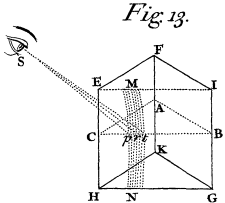Let HFG represent a Prism in the open Air, and S the Eye of the Spectator,[Image 14] viewing the Clouds by their Light coming into the Prism at the plane side FIGK, and reflected in it by its base HEIG, and thence going out through its plane side HEFK to the Eye. And when the Prism and Eye are conveniently placed, so that the Angles of incidence and reflexion at the base <125> may be about 40 degrees, the Spectator will see a Bow MN of a blue Colour, running from one end of the base to the other, with the concave side towards him, and the part of the base IMNG beyond this Bow will be brighter than the other part EMNH on the other side of it. This blue Colour MN being made by nothing else than by reflexion of a specular superficies, seems so odd a Phænomenon, and so unaccountable for by the vulgar Hypothesis of Philosophers, that I could not but think it deserved to be taken notice of. Now for understanding the reason of it, suppose the plane ABC to cut the plane sides and base of the Prism perpendicularly. From the Eye to the Line BC, wherein that plane cuts the base, draw the Lines Sp and St, in the Angles Spc 50 degr. 19, and Stc 49 degr. 128, and the point p will be the limit beyond which none of the most refrangible rays can pass through the base of the Prism, and be refracted, whose incidence is such that they may be reflected to the Eye; and the Point t will be the like limit for the least refrangible rays, that is, beyond which none of them can pass through the base, whose incidence is such that by reflexion they may come to the Eye. And the Point r taken in the middle Way between p and t, will be the like limit for the meanly refrangible rays. And therefore all the least refrangible rays which fall upon the base beyond t, that is, between t and B, and can come from thence to the Eye will be reflected thither: But on this side t, that is, between t and c, many of these rays will be transmitted through the base. And all the most refrangible rays which fall upon the base beyond p, that is, between p and B, and can by reflexion come from thence to the Eye, will be reflected <126> thither, but every where between t and c, many of these rays will get through the base and be refracted; and the same is to be understood of the meanly refrangible rays on either side of the Point r. Whence it follows, that the base of the Prism must every where between t and B, by a total reflexion of all sorts of rays to the Eye, look white and bright. And every where between p and C, by reason of the transmission of many rays of every sort, look more pale, obscure and dark. But at r, and in other Places between p and t, where all the more refrangible rays are reflected to the Eye, and many of the less refrangible are transmitted, the excess of the most refrangible in the reflected Light will tinge that Light with their Colour, which is violet and blue. And this happens by taking the line CprtB any where between the ends of the Prism HG and EI.