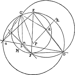 Sit A locus a quo corpuscula divergunt; B locus in quem convergere debent; CDE curva linea quæ circa axem AB revoluta describat superficiem quæsitam; D, E curvæ illius puncta duo quævis; & EF, EG perpendicula in corporis vias AD, DB demissa. Accedat punctum D ad punctum E; & lineæ DF qua AD augetur, ad lineam DG qua DB diminuitur, ratio ultima erit eadem quæ sinus incidentiæ ad sinum emergentiæ. Datur ergo ratio incrementi lineæ AD ad decrementum lineæ DB; & propterea si in axe AB sumatur ubivis punctum C, per quod curva CDE transire debet, & capiatur ipsius AC incrementum CM, ad ipsius BC decrementum CN in data ratione; centrisque A, B, & intervallis AM, BN describantur circuli duo se mutuo secantes in D: punctum illud D tanget curvam quæsitam CDE, eandemque ubivis tangendo determinabit. Q.E.I.