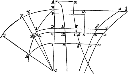 perpetuo retrahunt corpora de tangentibus ad circumferentias circulorum, atque adeo hæ sunt ad invicem in ratione prima spatiorum nascentium CD, cd: tendunt vero ad centra circulorum per Theor. II, propterea quod areæ radiis descriptæ ponuntur temporibus proportionales. Fiat figura tkb figuræ DCB similis, & per Lemma V, lineola CD erit ad lineolam kt ut arcus BD ad arcum bt: nec non, per Lemma XI; lineola nascens tk ad lineolam nascentem dc ut bt quad. ad bd quad. & ex æquo lineola nascens DC ad lineolam nascentem dc ut ad bd quad. seu quod perinde est, ut ad adeoque (ob æquales rationes ) ut ad Q.E.D.