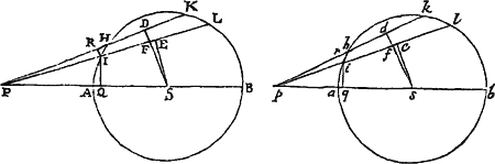 Etenim in AE capiatur linea quam minima Ee. Jungatur Pe, & in PPE, PA capiantur PC, Pf ipsi Pe æquales. Et quoniam vis, qua annuli centro A intervallo AE in plano prædicto descripti punctum quodvis E trahit ad se corpus P, ponitur esse ut FK, & inde vis, qua punctum illud trahit corpus P versus A, est ut , & vis, qua annulus totus trahit corpus P versus A, ut annulus & conjunctim; annulus autem iste est ut rectangulum sub radio AE & latitudine Ee, & hoc rectangulum (ob proportionales PE & AE, Ee & CE) æquatur rectangulo seu ; erit vis, qua annulus iste trahit corpus P versus A, ut conjunctim, id est, ut contentum , sive ut area FKkf ducta in AP. Et propterea summa virium, quibus annuli omnes in circulo, qui centro A & intervallo AD describitur, trahunt corpus P versus A, est ut area tota AHIKL ducta in AP. Q.E.D.