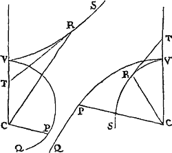 Corol. 1. In spatiis vel mediis non resistentibus, si areæ non sunt temporibus proportionales, vires non tendunt ad concursum rediorum; sed inde declinant in consequentia, seu versus plagam in quam fit motus, si modo arearum descriptio accelaratur: sin retardatur, declinant in antecedentia.